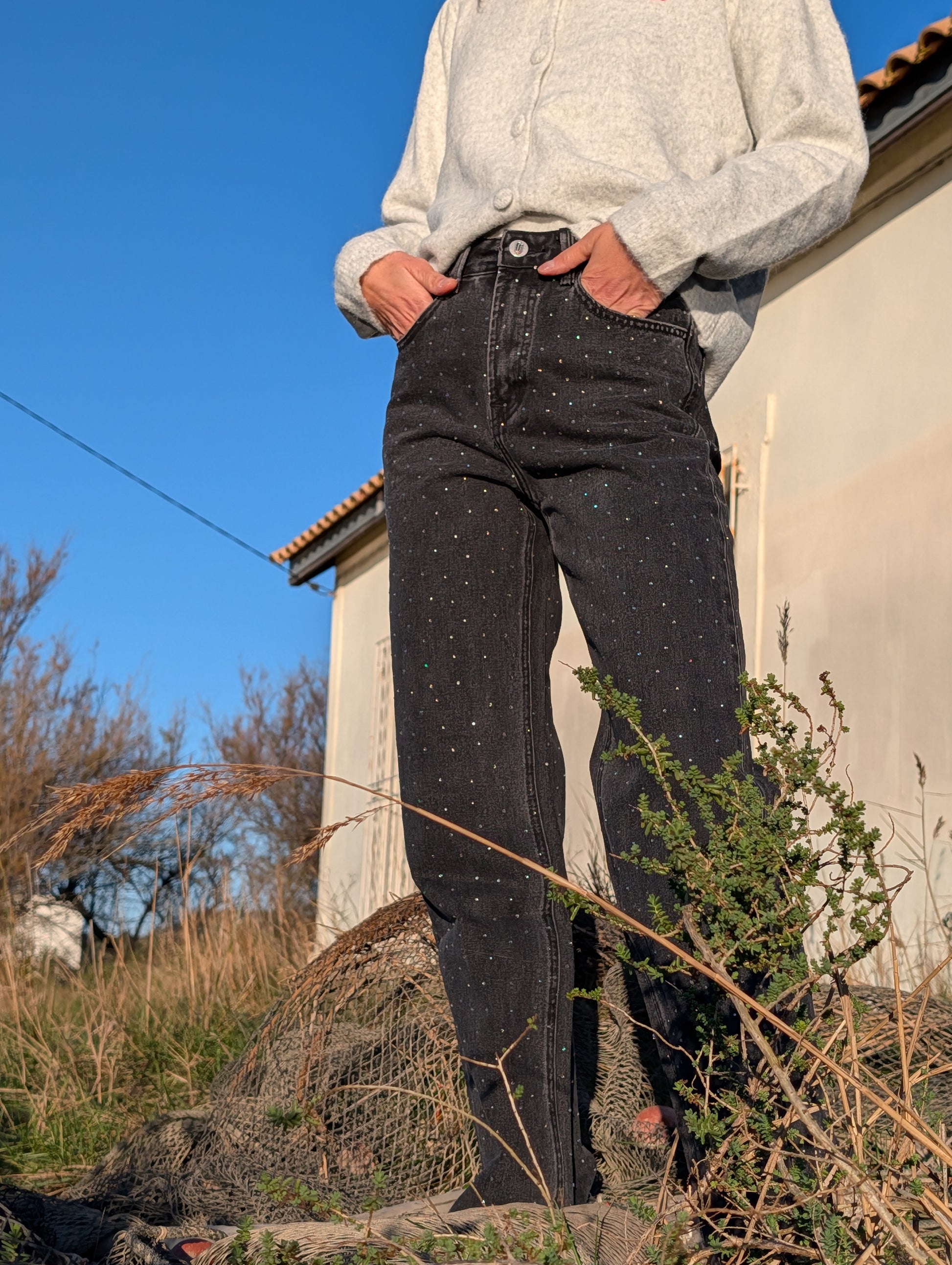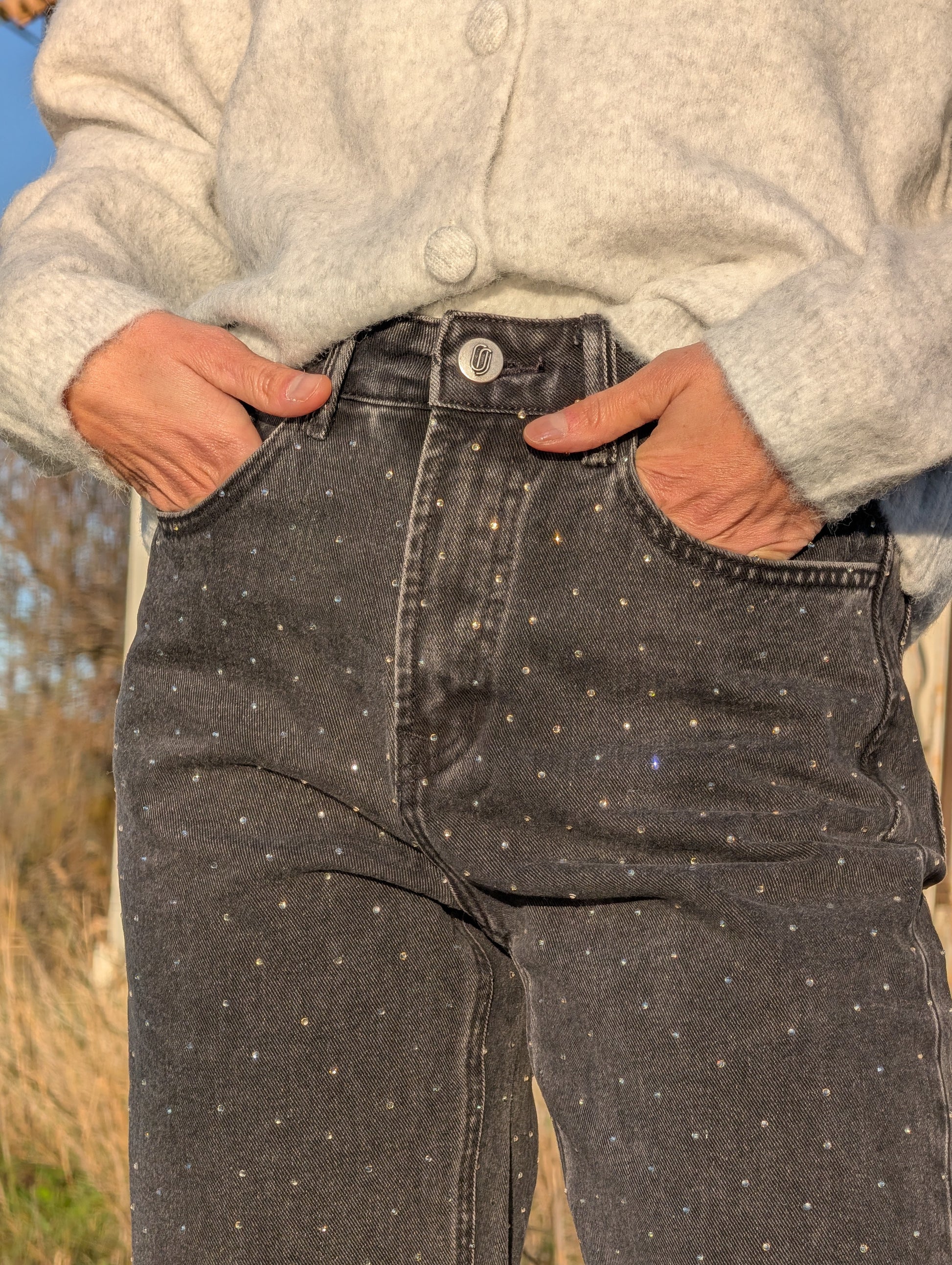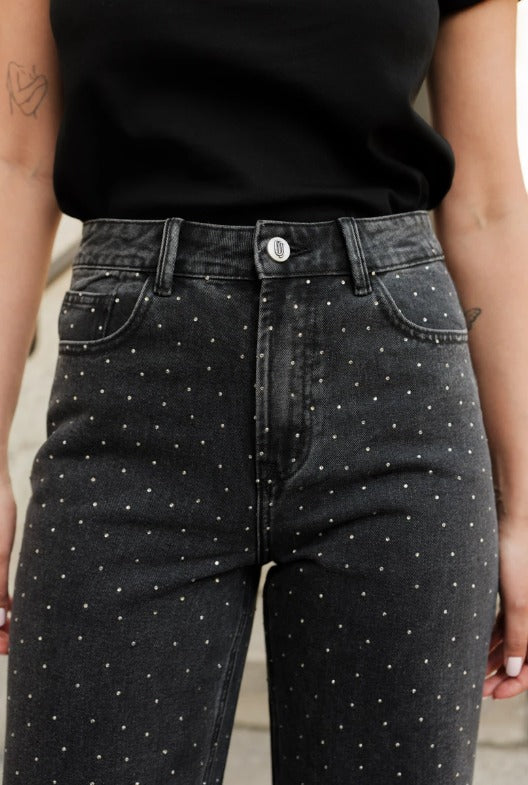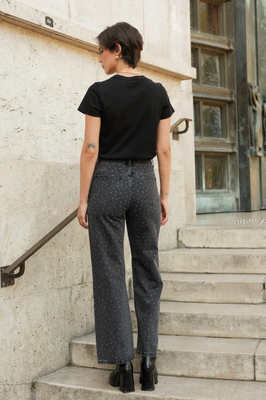 Le jean Alix est un indispensable revisité : sa coupe wide structure la silhouette tout en assurant un confort absolu. Les strass délicatement répartis apportent juste ce qu’il faut de brillance pour un look chic, moderne et sans effort.